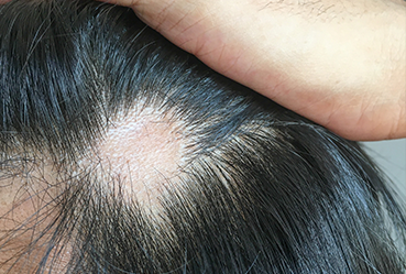 Процесс характеризуется появлением красных отечных пятен, которые могут быть покрыты корками и маленькими пузырями. По мере прогрессирования они распространяются, захватывая новые участки. Волосы на данных участках становятся ломкими, поэтому начинают выпадать1,4.